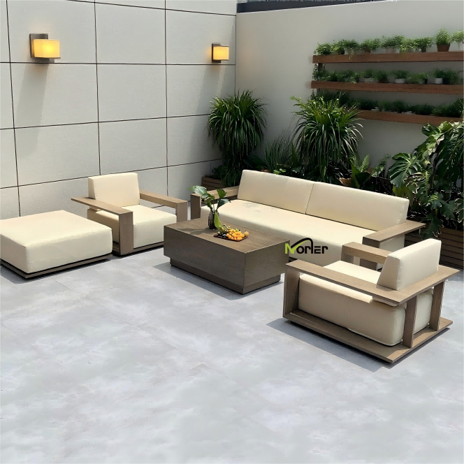 5. Zunanji kavč iz tikovine: ta kavč je narejen iz naravnega tikovine, ki je izjemno odporna na vremenske vplive, in se ponaša s fino zrnatostjo, visoko stabilnostjo in z uporabo razvije bolj razkošen občutek, zaradi česar je klasična izbira za ustvarjanje vrhunskega balkona v stilu letovišča.